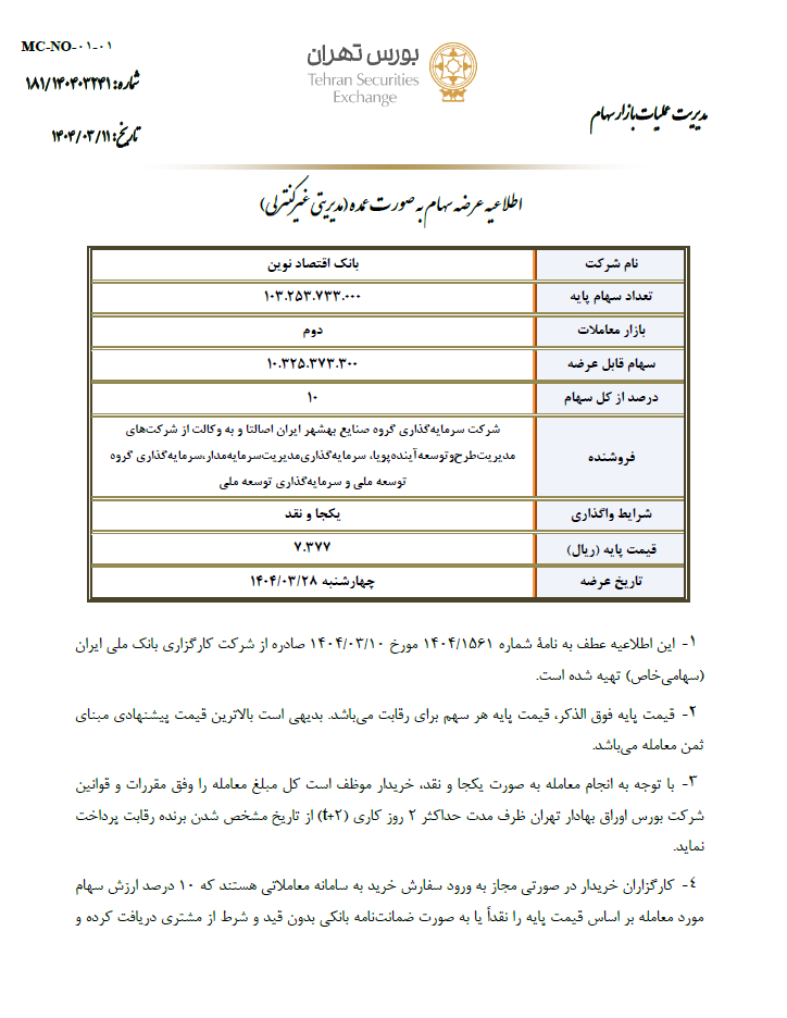 به گزارش مدیریت ارتباطات و اطلاع رسانی توسعه صنایع بهشهر، پیرو سیاستهای کلان بانک ملی ایران در راستای اجرای قوانین بالادستی در خصوص واگذاری شرکتها و خروج از بنگاهداری، شرکت سرمایه گذاری گروه صنایع بهشهر ایران در نظر دارد تعداد ۱۰۳.۲۵۳.۷۳۳.۰۰۰ سهم (معادل ۱۰%) از سهام بانک اقتصاد نوین با نماد “ونوین” را با مشخصات و شرایط ذیل واگذار نماید. قیمت پایه بر اساس قیمت پایانی تابلوی معاملات سهام در روز انتشار آگهی عرضه یا روز قبل از تاریخ عرضه، هر یک بالاتر بود، به اضافه ۱۲۵ درصد قیمت مذکور به عنوان صرف سهام می باشد. سهام مذکور در روز چهارشنبه مورخ ۱۴۰۴/۰۳/۲۸ عرضه خواهد شد. قیمت اعلامی صرفاً قیمت پایه برای عرضه بوده و بدیهی است که بالاترین قیمت پیشنهادی، مبنای ثمن معامله براساس شرایط اعلامی خواهد بود.